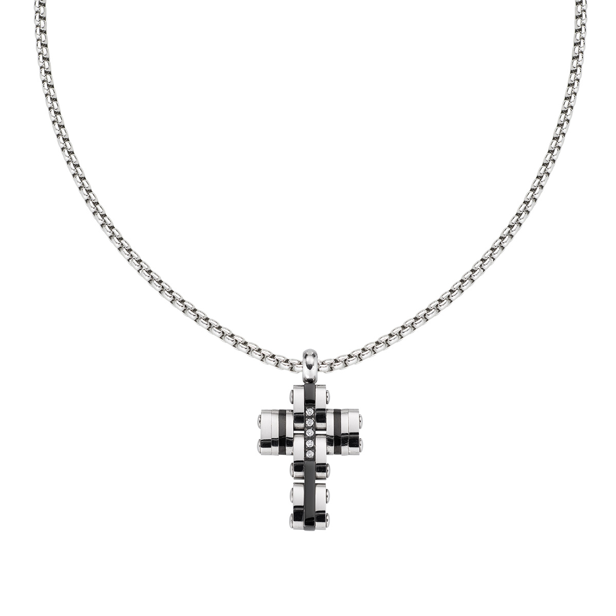 Stainless steel necklace with white zirconia – Steel/Black PVD – length 46 + 4 cm – cross 2 x 1,5 cm