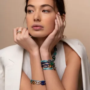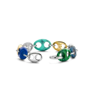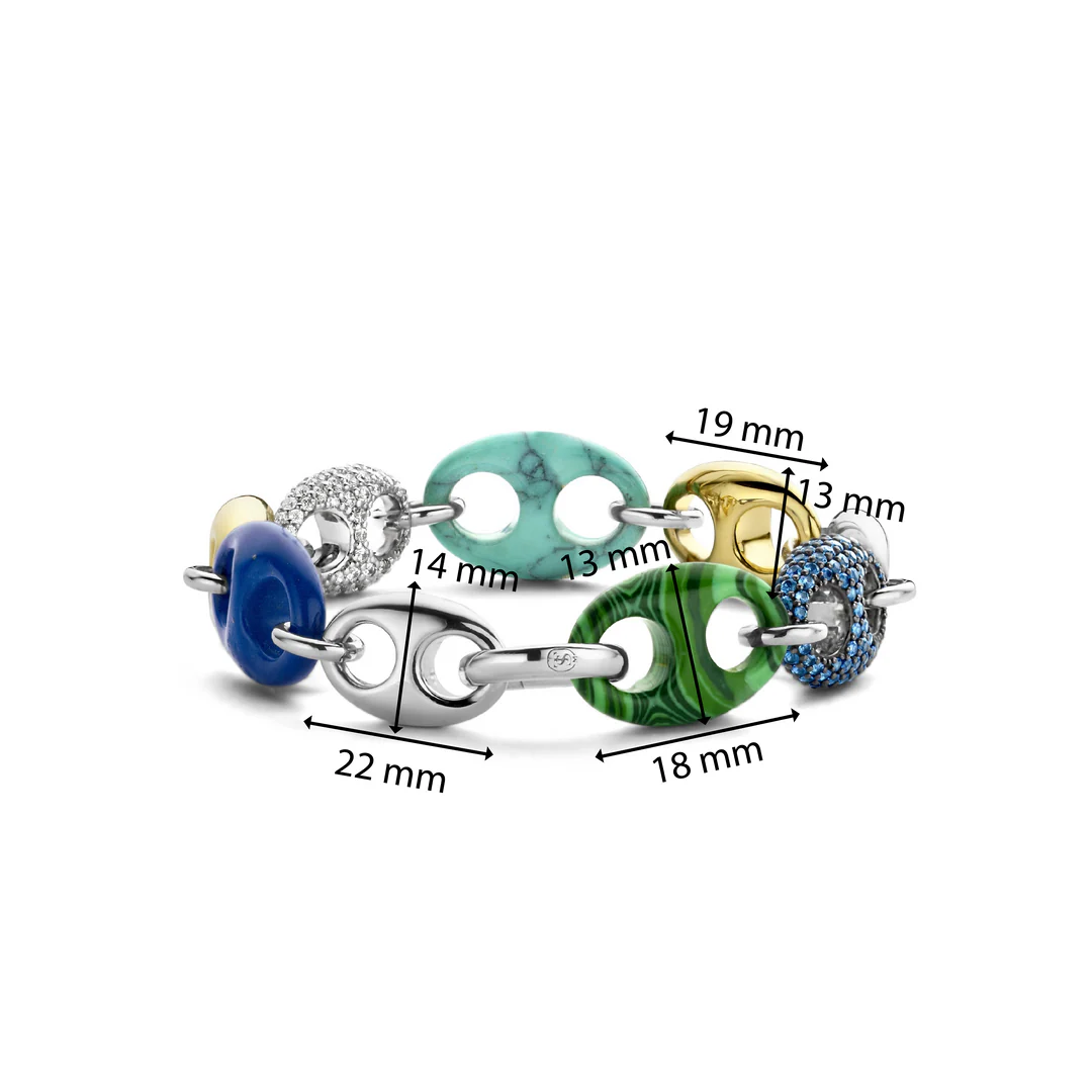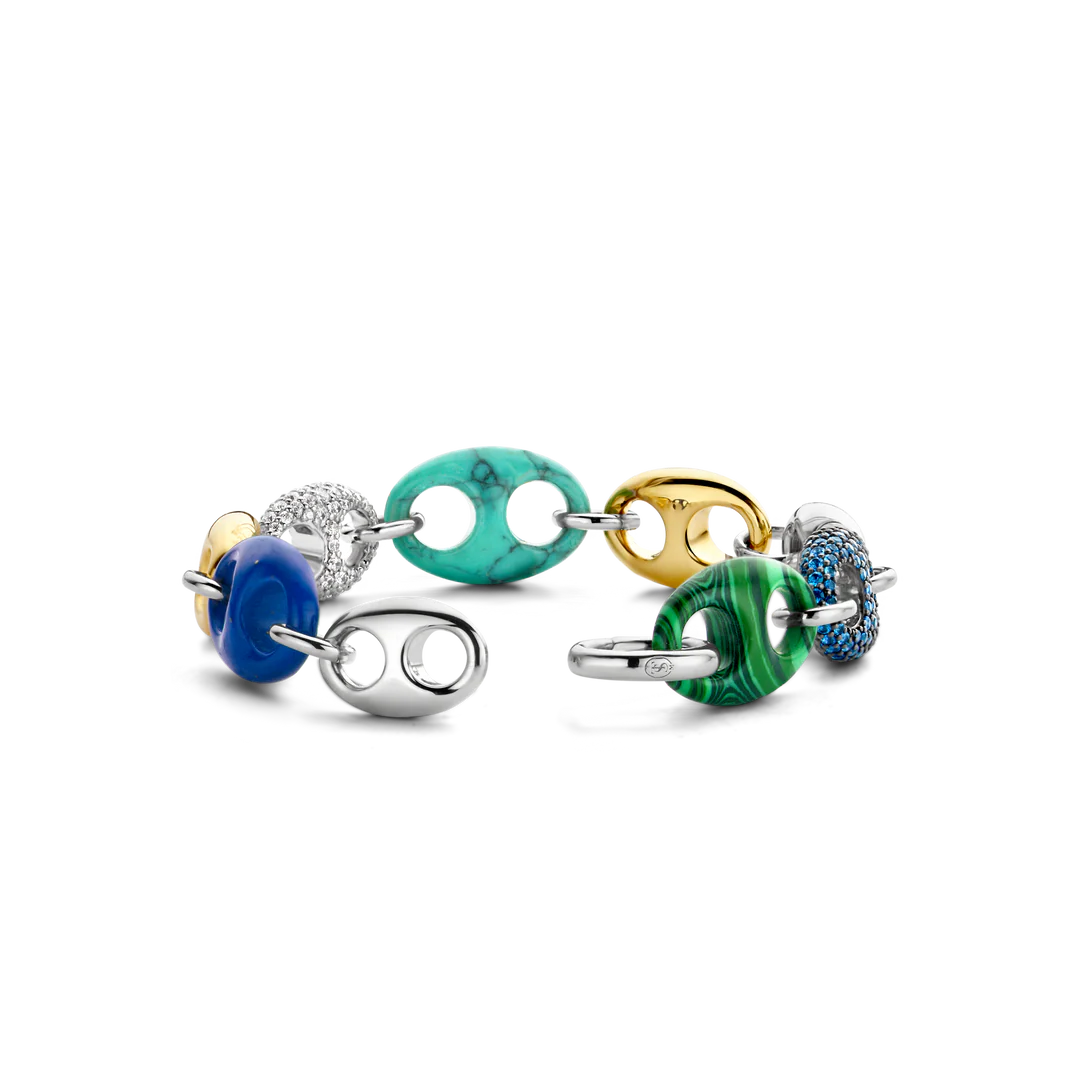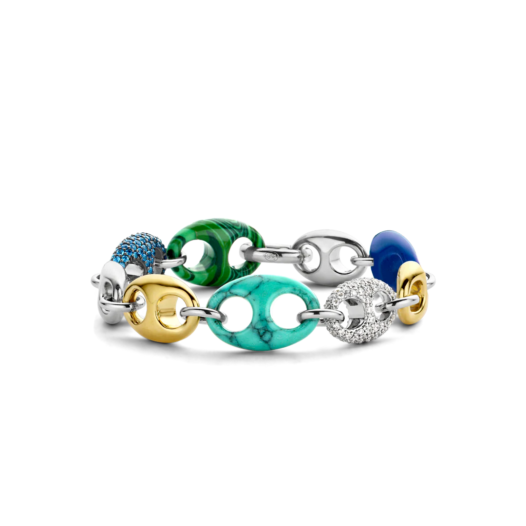 This TI SENTO gold-plated silver bracelet 2988TQ flaunts a stream of colourful coffee bean tokens. Malachite green, turquoise, lapis blue, pavé and gold-plated silver alternate creating a playful yet luxurious statement piece. The bracelet is crafted from 925 sterling silver. The classic coffee bean shapes were redesigned here with a touch of playful edginess. Decorate your wrists with this sophisticated statement piece.