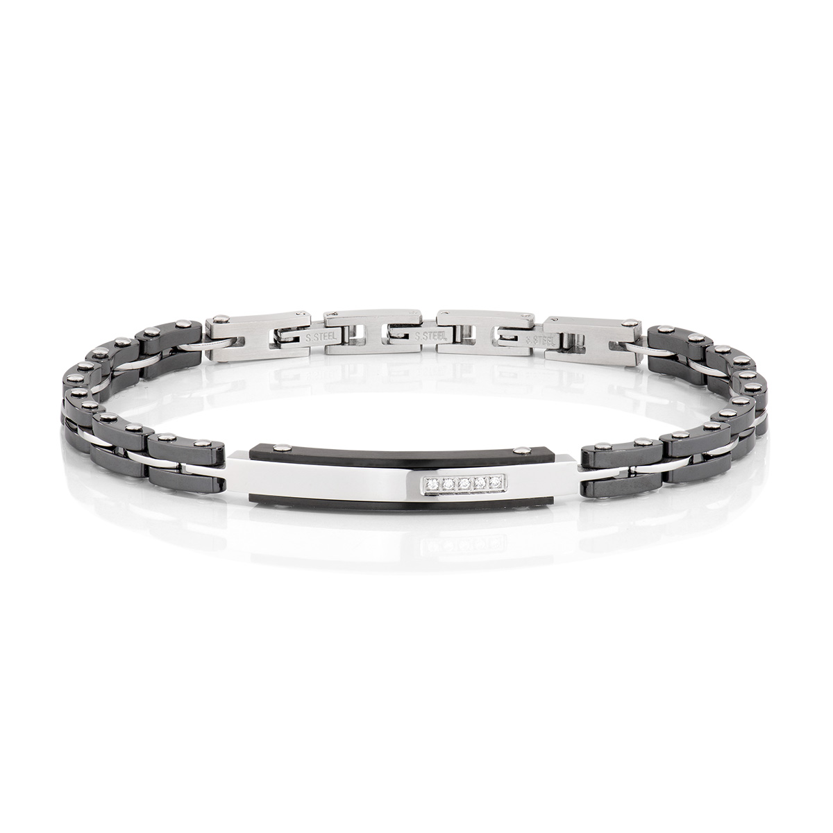 Stainless steel bracelet with black ceramic and white diamonds – Steel – length 19 + 1 + 1 cm – central element 3,8 cm – diamond Ø 1 mm