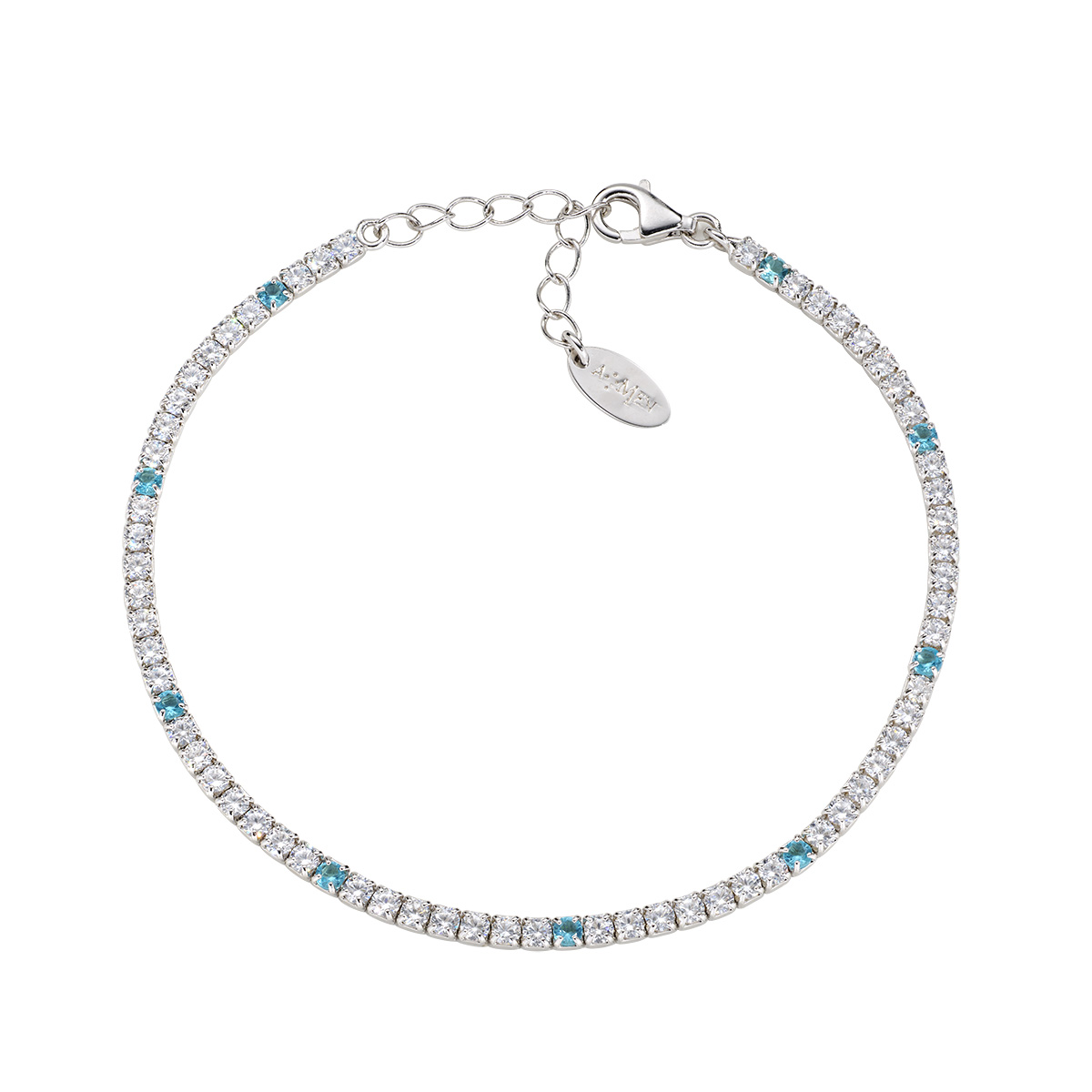 Sterling silver bracelet with aquamarine and white zirconia – Rhodium – length 16 + 3 cm – Ø 2 mm zirconia