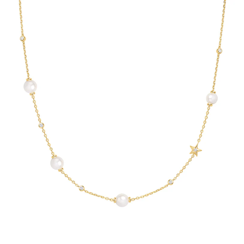 Miss Dainty is designed for the woman who loves elegance with a touch of whimsy. The exquisite and romantic design, combined with fine craftsmanship, ensures you radiate charm. This necklace features pearl and cubic zirconia stations, with a star-shaped accent that breaks the regular arrangement, embodying grace and subtle sophistication. It is perfect for both professional occasions and everyday wear.