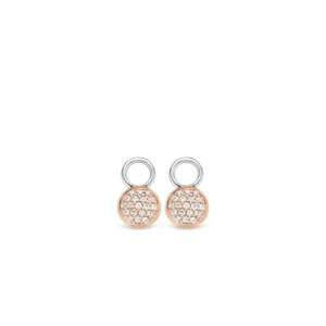 These delicate stud ear charms designed in-house by the talented team of TI SENTO jewellery designers are a pleasing blend of silver and rose-gold. A simple and elegant loop of high-quality sterling silver is plated with a rhodium finish to give a long lasting shine. Attached to this is a circular disc of rose gold. Hand-set into the disc are faceted brilliant-cut cubic zirconias and dots of rose gold, which combine together to create an attractive sparkling effect. These ear charms are perfect for cocktail dressing on their own or can be styled with otherjewellery in the TI SENTO Mix & Match concept.