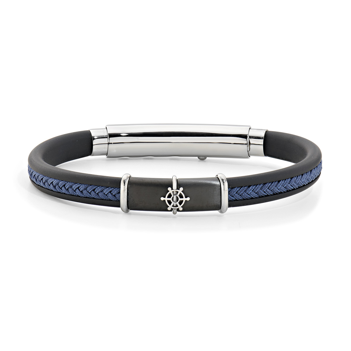 Stainless steel bracelet with rubber and black cotton cord – Steel and Black PVD – Length 19 + 1 + 1 cm