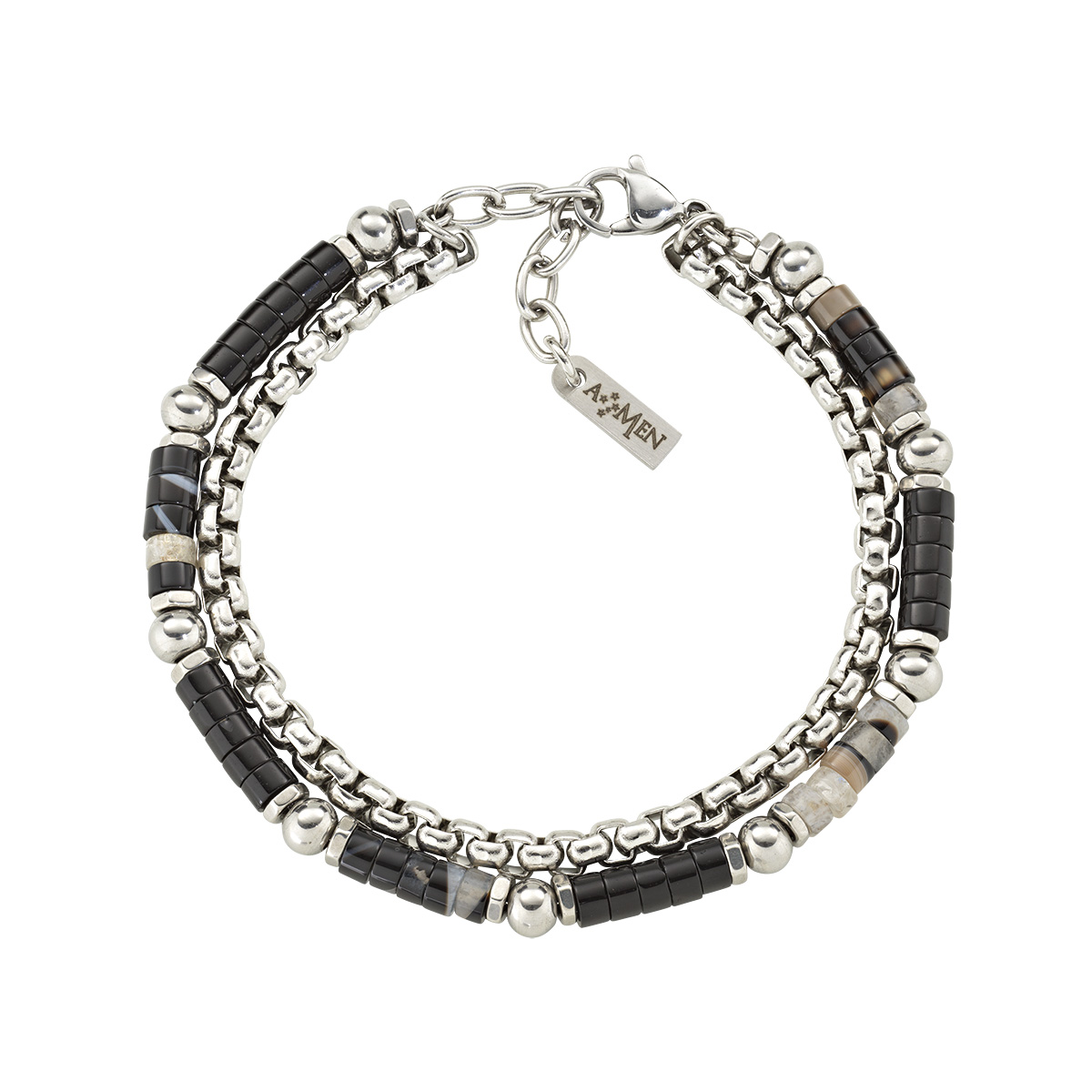 Stainless steel bracelet with black and banded agate – Steel – length 19 + 1 + 1 cm – Ø 4 mm gemstones