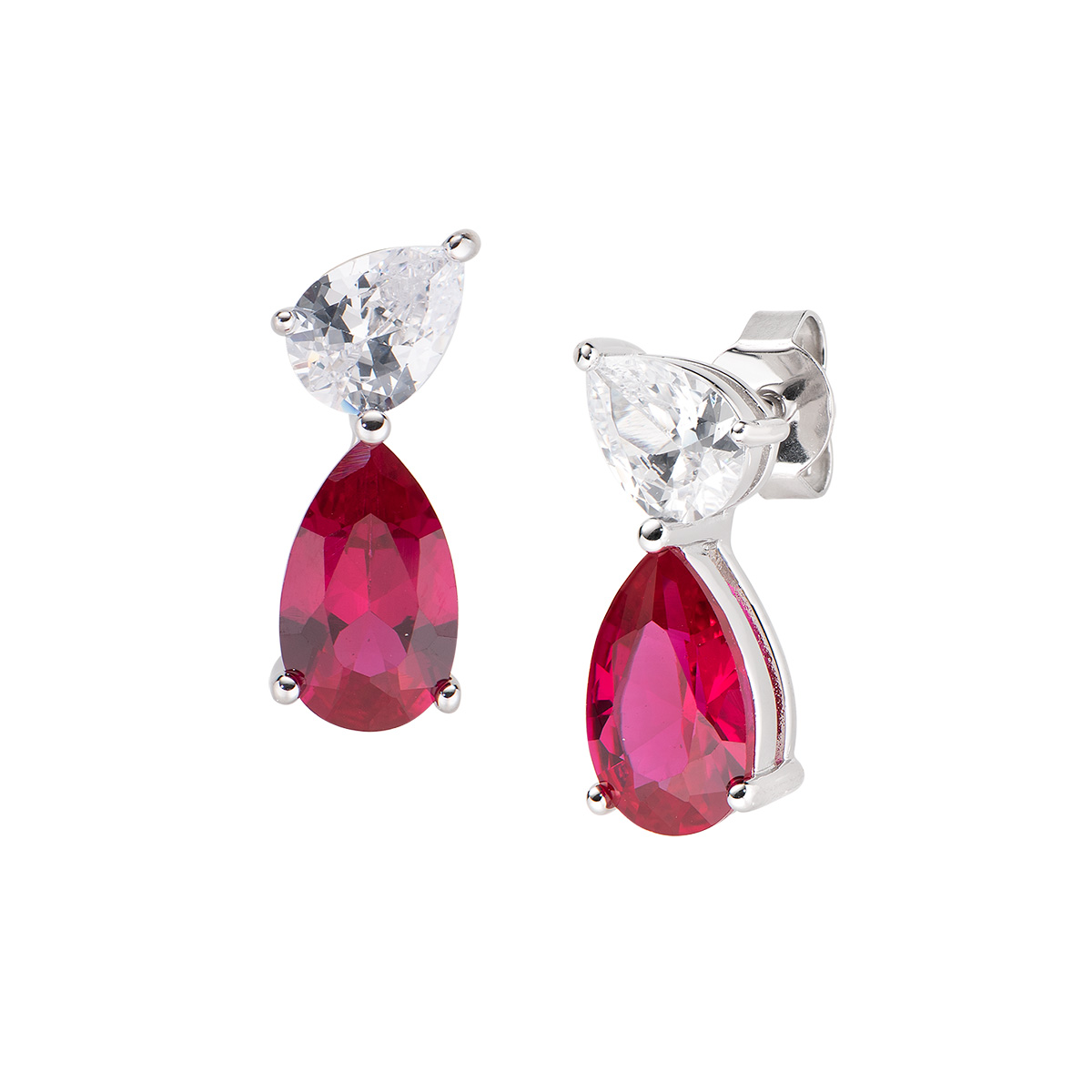 Sterling silver earrings with red and white zirconia – Rhodium – height 1,7 cm – drop cut red zirconia 10 x 6 mm